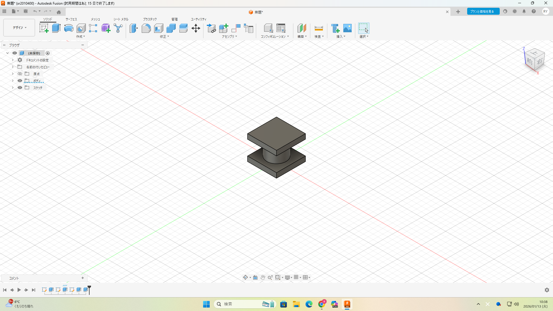 まずは「スケッチ」で、スタンプの持ち手となる四角や円を描き、「押し出し」で10mm〜20mmほどの厚みにします。