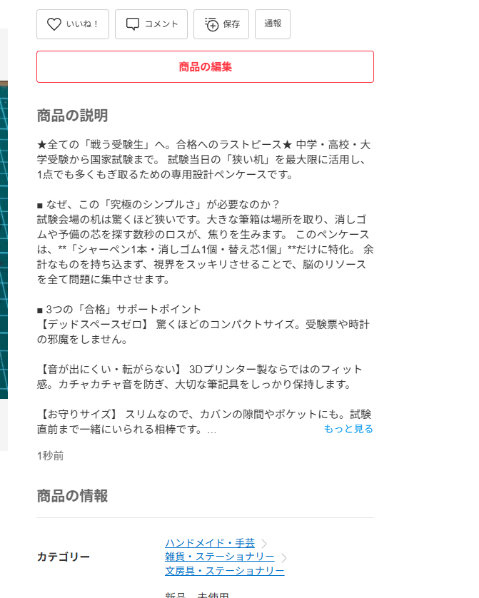 一度出品したものを消して出し直すのは少し勇気がいりましたが、これも「市場での学び」です。 「やってみて、ダメなら工夫して、もう一度挑む」。 これって、3Dプリンターの試作と全く同じだなと感じています。