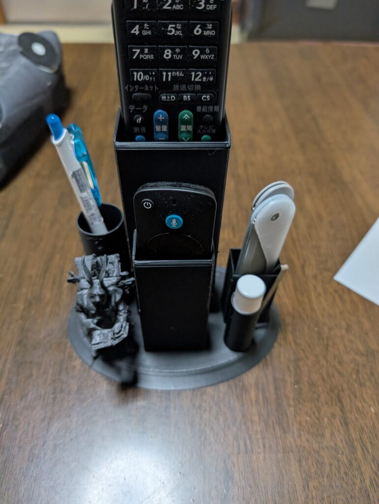 プリントがうまくいかない間、ただ待っているのはもったいない。 そこで、乱雑になっていた「こたつ机」を整理するためのリモコン&リップクリームスタンドを設計・プリントすることにしました。