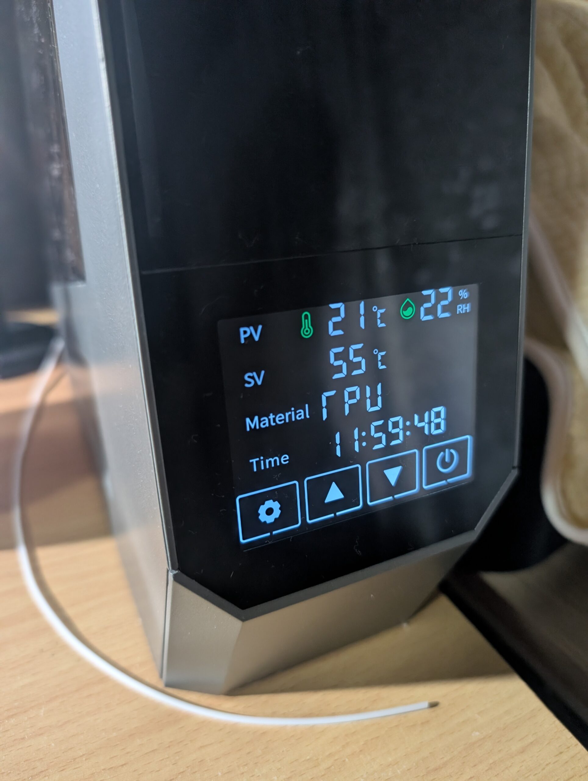 とはいえ、ただ寝るだけでは終わらないのがおじさん流。 明日の朝、スッキリ目覚めた時にすぐ戦えるよう、フィラメントをドライヤーにセットしてスイッチを入れました。