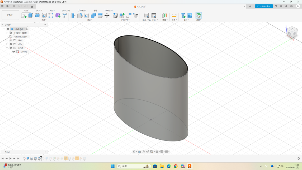 まずは、自分に課している**「毎日30分のFusion 360」**からスタート。 昨日の反省を活かし、今日は基本操作を再確認しつつ、モデルの「厚み」や「結合」の出し方を重点的に練習しました。