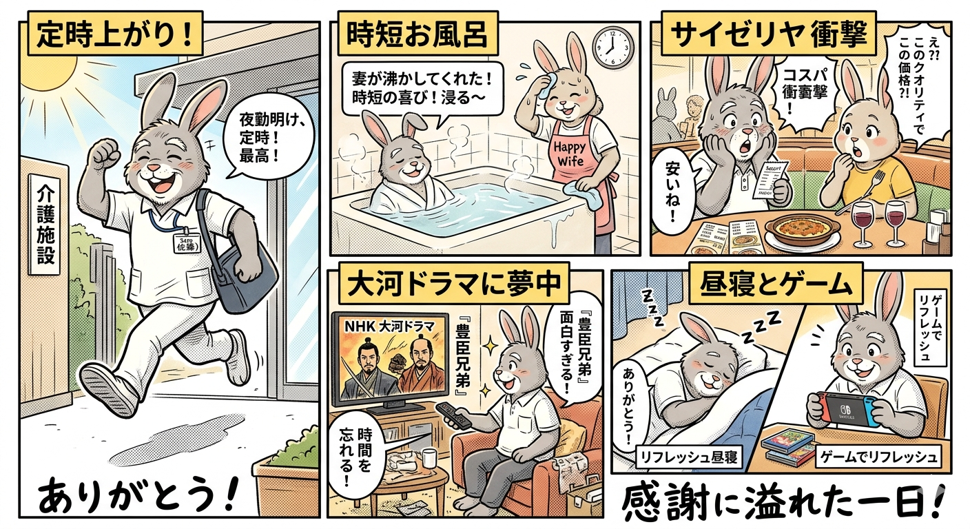 今回の夜勤は、珍しく(?)ほぼ定時ちょっと過ぎに業務を終了することができました!なんだかんだで残業になりがちなこの仕事、スパッと終わって帰れるのは、それだけで最高のご褒美です。