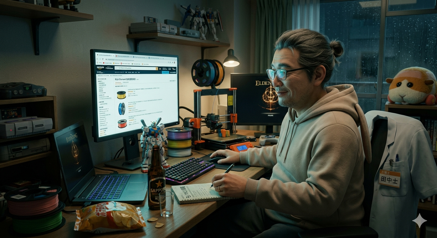 現在、3Dプリンターの方は一時休止中。 というのも、次に使う**フィラメント(材料)**の購入を検討しているところなのです。
