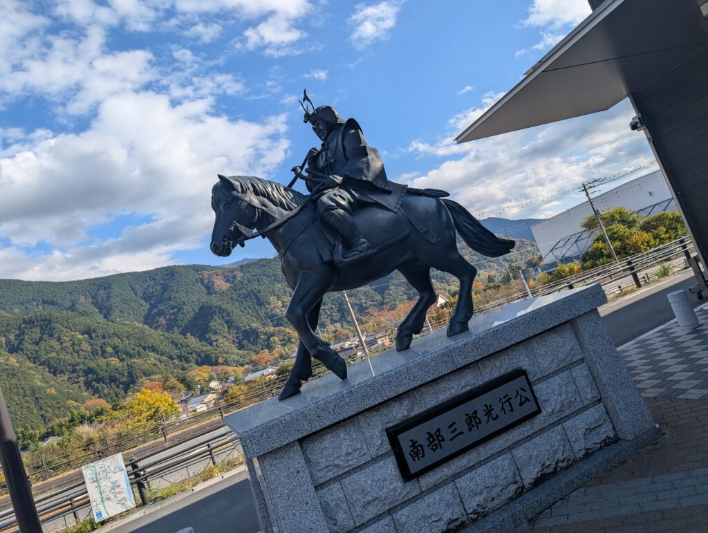 • その功により、甲斐国南部牧(現在の山梨県南巨摩郡南部町)を与えられ、この地の名をとって南部姓を称したのが南部氏の始まりと伝わります。