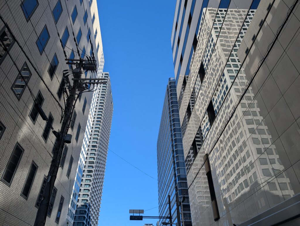 会場に向かう道、、、ビルの間から覗く、、、青い空、、、、