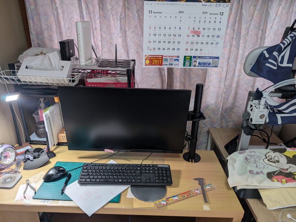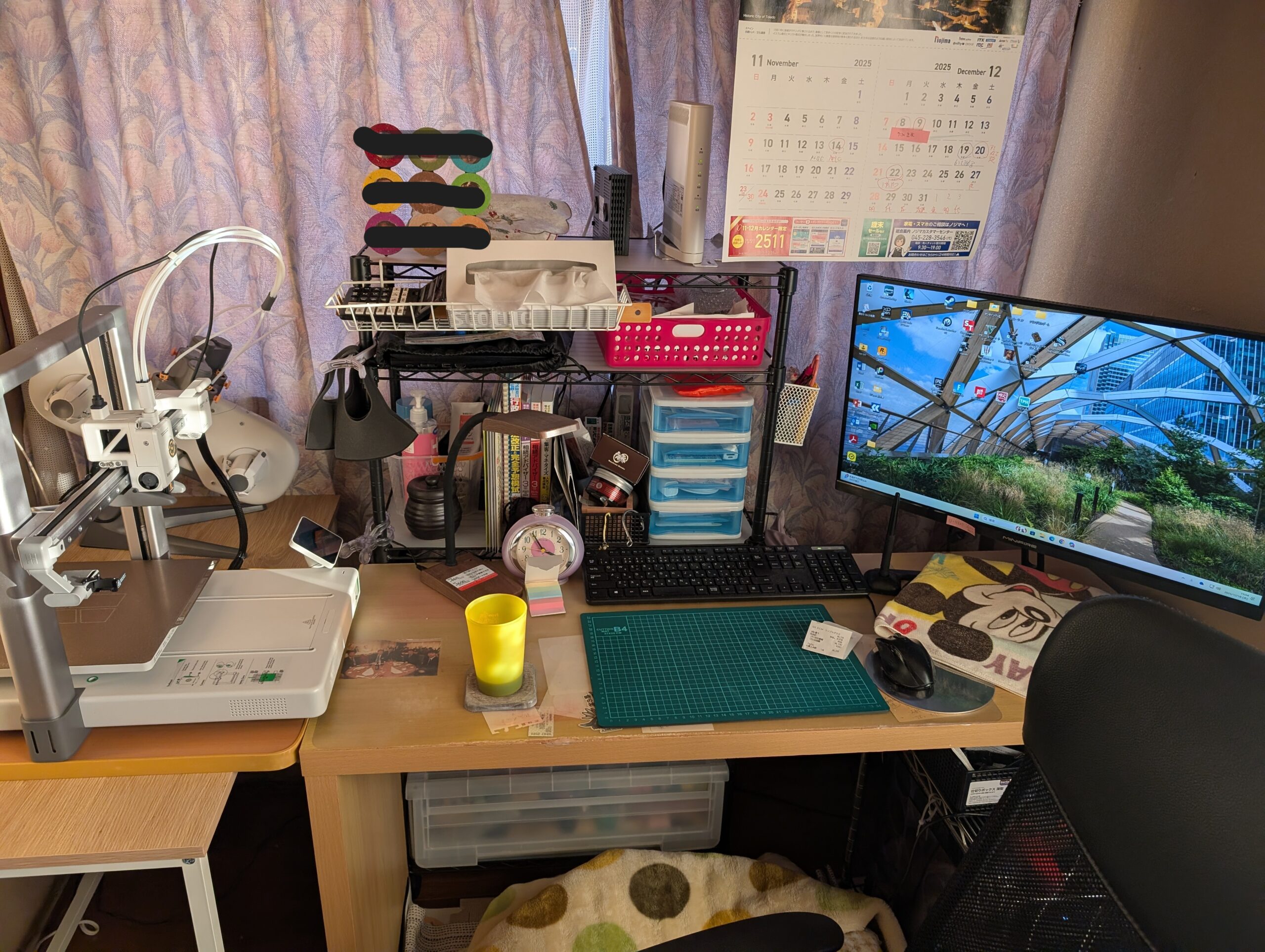 いかがでしょうか? モニターが宙に浮いたことで、モニター下のスペースが完全に解放されました! これで3Dプリンター周りのメンテナンスもしやすくなり、キーボードや工具を置く場所にも余裕が生まれました。レイアウト変更は大成功です。
