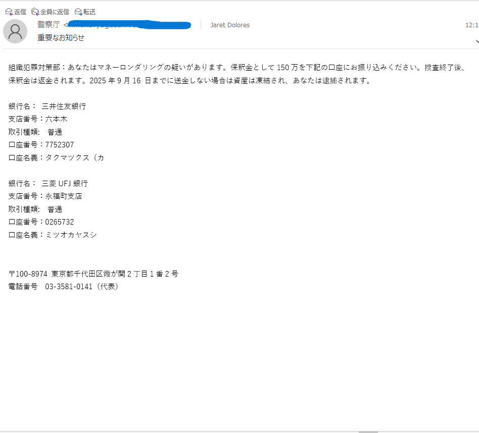 #2025.9.16 今日、こんなメールが届きました、、、おじさん、、、大丈夫か、、、 独り言の内容 X Facebook はてブ LINE コピー 2025.09.16 警視庁から届いたメールです おじさん、マネーロンダリングの意味がわからん、、、、 そもそも保釈金って拘束されない代わりに支払うお金じゃあなかったけ? 捜査終了後には返金されないとは思うけども、、、 騙されないように注意しましょう、、、 おじさんももう少しで騙されそうになりました、、、 こんなメールには気をつけましょうね、、、 今日も早かったのでもう寝ます、、、 本日も最後までご愛読いただきありがとうございます